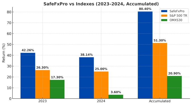 Resultatet för SafeFXPro hamnade under 2023 på lite högre nivå än vårt mål på 3%. Från Januari till December 2023 blev resultatet på 3,52% i snitt. Så det totala resultatet 2023 blev 42,26%, vilket blev betydligt högre än vårt mål. Självklart får våra kunder all vinst som görs per månad, vinsten är alltså inte begränsad till 3% per månad. 2024 blev resultatet lite lägre, men vi gjorde ändå 38,14%, vilket blev ett snitt på 3,17% per månad, vilket också blev högre än målet på 3%.