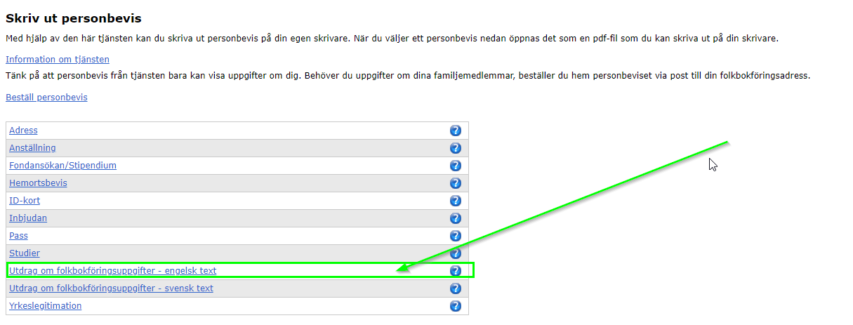 4. Klicka på ”Utdrag om folkboföringsuppgifter – Engelsk text”